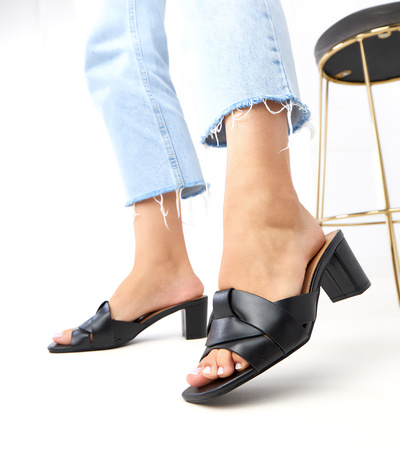 Juodi klasikiniai natūralios odos šlepetės ant kulno „Risana“