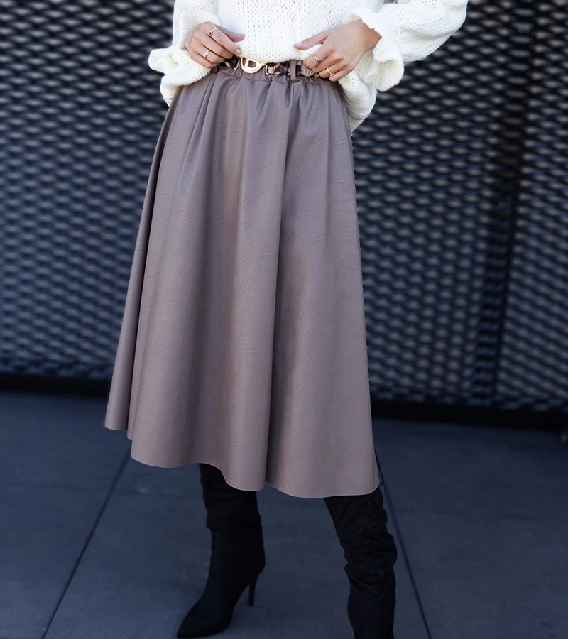 ( produktų kiekis: 5 )Tamsiai smėlio spalvos ilgas sijonas, puoštas diržu su gyvūnų motyvu Hanie