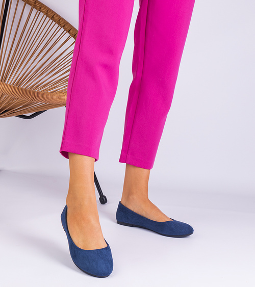 Tamsiai mėlynos zomšinės moteriškos balerinos su kaspinu Ingera